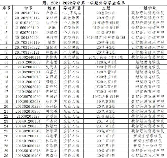 根据《普通高等学校学生管理规定》(教育部令第41号)第二十五条、第二十七条和《广州华南商贸职业学院学生学籍管理规定》第十四条、第十六条之规定,经学生申请、二级学院审核、教学科研部复核、校领导审批,同意丘乐华等30名学生休学申请并予以公示(具体名单详见附件)。公示期:2021年12月6日—12月10日,公示期内如有异议,请向教学科研部据实反映。