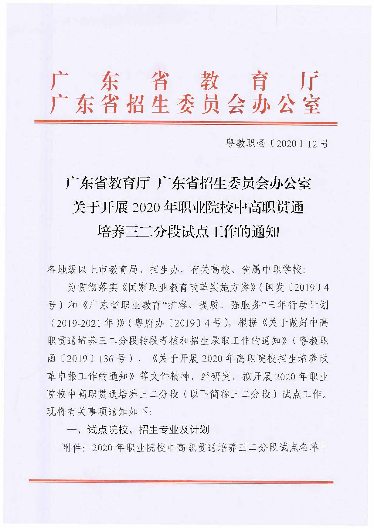 从广东省教育厅下发《关于开展2020年职业院校中高职贯通培养三二分段试点工作的通知》(粤教职函〔2020〕12号)文件获悉,我院中高职贯通培养三二分段试点工作申报获得省教育厅审核通过,这是继我院2020年三二分段专升本协同育人试点获批后,再获殊荣。
