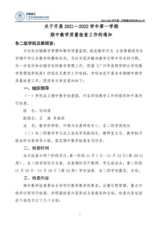 教学科研部014号-关于开展2021-2022学年第一学期期中教学质量检查工作的通知