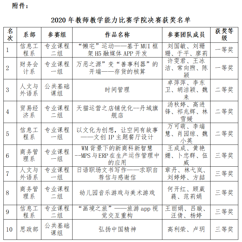 附件:2020年教师教学能力比赛学院决赛获奖名单